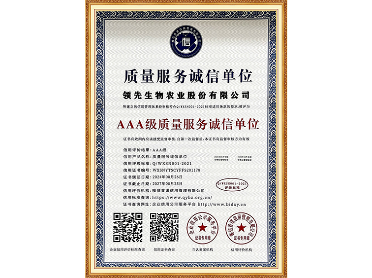AAA級質(zhì)量服務(wù)誠信單位
